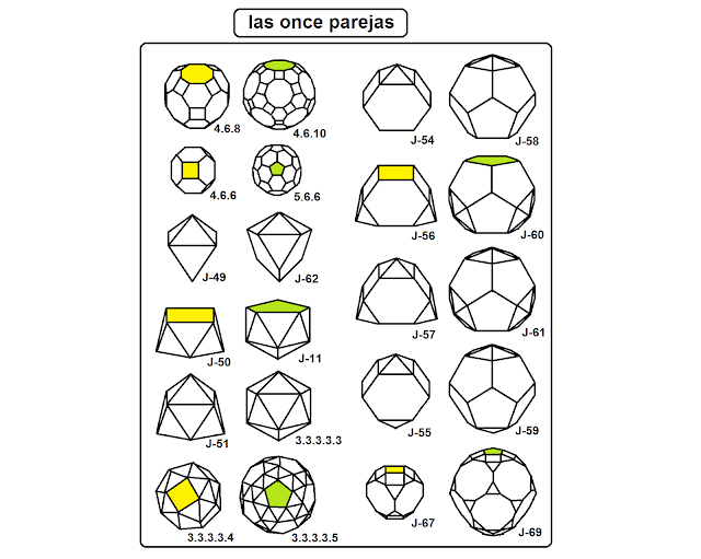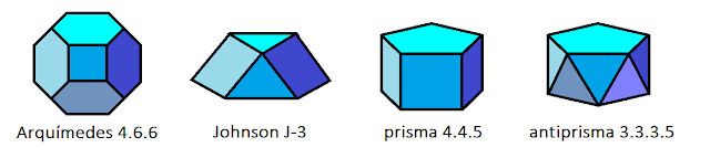 J'avais peur de cela: je rêve de structures électroniques et des escaliers de Janet, verticaux et horizontaux, pleins de polyèdres …! Je suis devenu obsédé … (M. López. Vous devriez faire plus attention aux œuvres que vous nous demandez …) De plus, les noms de ces polyèdres sont affreux: orthobicupole, hebesphénomégacorone, etc. Heureusement, Johnson à l'intérieurentreprise ses solides de (J-1) à (J-92) … Les 28 autres polyèdres sont uniformes et déterminés par les polygones joignant un sommet: le cube serait (4.4.4) car dans chaque sommet, il y a 3 routes. J'espère ne pas perdre la tête …