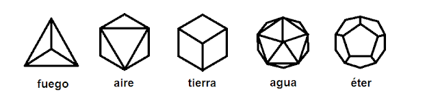 Platon possédait cinq polyèdres communs (Tétraèdre, Octaèdre, Cube, Icosaèdre et Dodécaèdre) pour les quatre éléments naturels (Feu, Air, Terre et Eau).